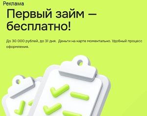 Сумма: от 3000 до 30 000 рублей. Срок: от 1 до 31 дней. Ставка: бесплатно для новых клиентов. Требования: Гражданство РФ. Возраст от 18 лет. Только паспорт. Способы получения: Банковская карта. Рекламодатель: ООО Информационное агентство „Банки.ру“ ИНН:7723527345 ОГРН:1047796964522 | |