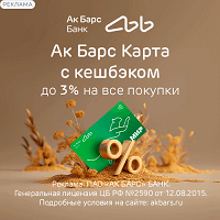 Преимущества: Кэшбэк до 50% за оплату на маркетплейсах; 3% на такси - топливо - красоту и развлечения, до 3% за все покупки. Для зарплатных клиентов и пенсионеров дополнительный кэшбэк 3% в мед. учреждениях и аптеках. Доход по накопительному счёту до 11% годовых на остаток. Переведите пенсию на Ак Барс Карту и получите 2 000 руб. к первому зачислению. Порекомендуйте Ак Барс Карту своим друзьям и получите по 1500 руб. за каждого привлеченного друга.
