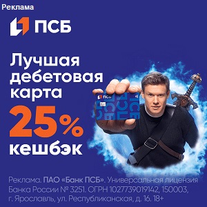 Акция: С 01.08.2025 по 31.12.2025 года оформи карту, храни на счете карты от 100 000 рублей и получай дополнительный кэшбэк 25% до конца 2025 года. Описание условий: Обслуживание и выпуск бесплатно. Возможность выпустить карту Мир и Mastercard. Бесплатное снятие наличных до 30 000 руб. в любых банкоматах, а в банкоматах Промсвязьбанка и банков - партнеров (Альфа-Банк, Россельхозбанк, МИнБанк и УБРиР) бесплатно до 600 000 руб.мес. Бесплатные переводы по номеру телефона в другой банк до 100 000 руб. в месяц, а себе до 50 млн. рублей. Бесплатная доставка карты от 1 дня. Можно сделать карту зарплатной, пенсионной. Расскажите друзьям о карте ПСБ и целый год получайте до 1000 рублей в месяц за каждого приглашенного друга. Преимущества: Приветственный кэшбэк на все покупки 25%, в трёх выбранных категориях 5% и 1% за все покупки, или 1,5% на всё. Доход по накопительному счёту до 23% годовых. Требования: Паспорт РФ. Способы получения: В отделении банка. Доставка курьером - бесплатно. Услуги оказывает: ПAO Банк "ПСБ" Генеральная лицензия на осуществление банковских операций № 3251 от 1 апреля 2025 г. | |
