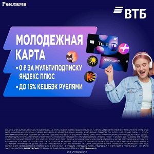Описание условий: Бесплатное оформление и обслуживание карты без скрытых условий. 30 дней бесплатного доступа к мультиподписке Яндекс Плюс (Яндекс.Музыка, Кинопоиск, Яндекс.Книги), далее при соблюдении условий сервиса "Молодежь Плюс". Яндекс Плюс клиентам от 14 - 25 лет бесплатно. Скидка 50% на связь и интернет в ВТБ Мобайл. Кэшбэк 3 000 руб. ежемесячно в категориях на выбор. Платежи, переводы и снятие наличных без комиссии. Оплата цифровых сервисов и онлайн-игр (Steam, PS Store, XBox, Spotify и др.) без комиссии. Лимитированный дизайн.